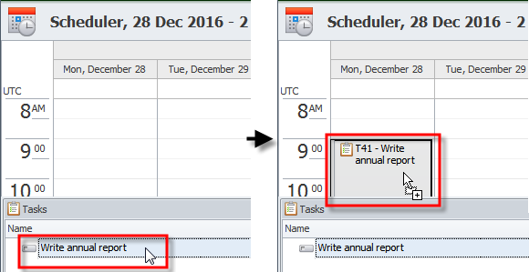 Note When you resize or drag your task schedule items on the Scheduler view, their start and finish date & time changes automatically on the Schedule tab of the Task dialog box.